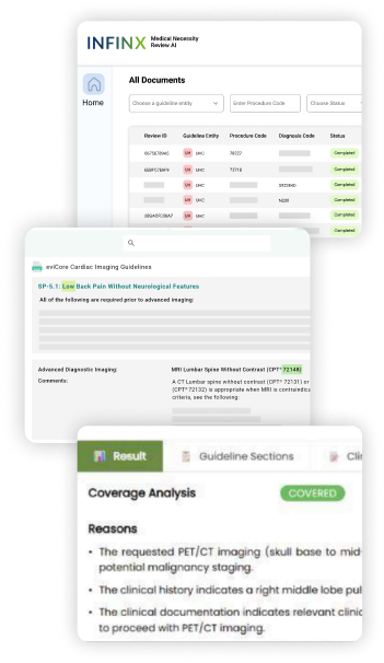 Start with manual uploads or integrate for full automation. For ambiguous or edge-case scenarios, Infinx clinical specialists provide human review to ensure consistent, reliable outcomes across specialties.