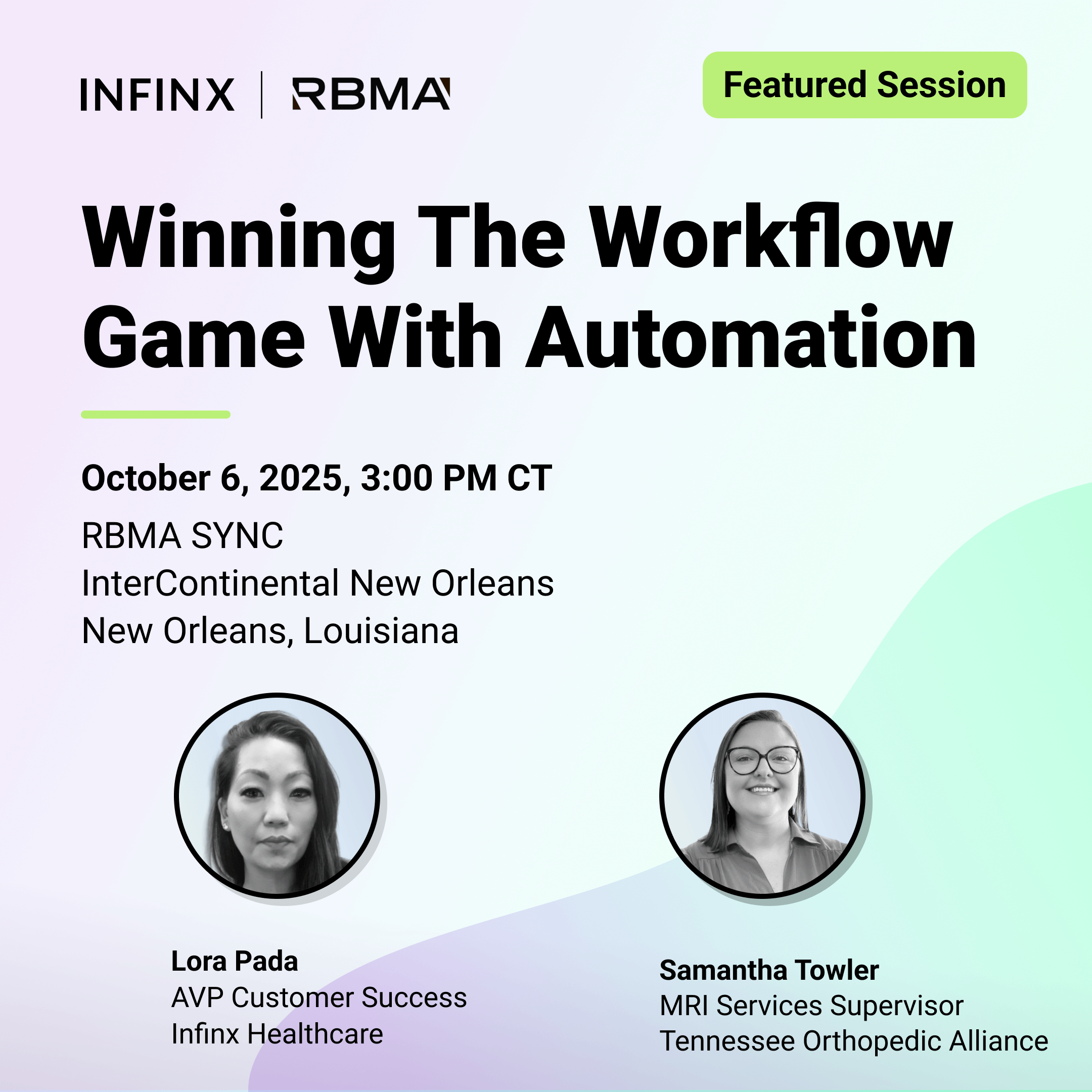 Eric Grone and Lora Pada from Infinx will be on site and ready to connect. If intake bottlenecks, delayed authorizations, or underperforming systems are slowing you down, we should talk. Infinx helps radiology groups automate the tasks that drain time and delay care, turning referrals into scheduled, authorized patients faster.