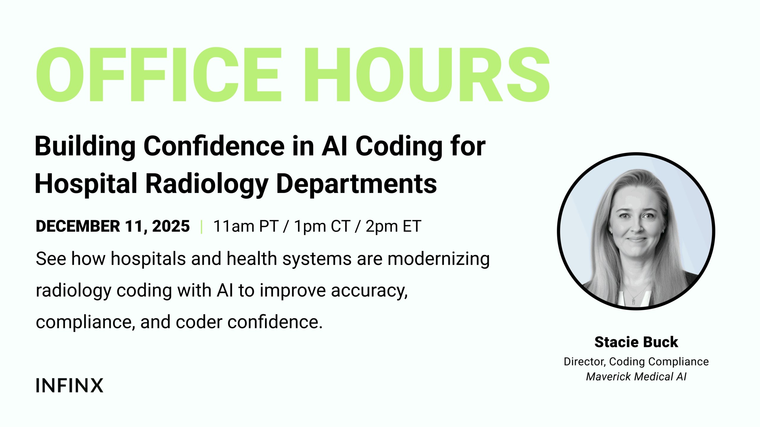 In this Office Hours session, we’ll explore how AI-driven coding is addressing the unique challenges hospital radiology teams face, from chargemaster dependencies and manual diagnosis coding to compliance and medical necessity risks. Joined by Stacie Buck, Director of Coding Compliance at Maverick Medical AI, we’ll discuss how autonomous coding is evolving to meet these demands—helping hospitals improve accuracy, reduce administrative burden, and build coder confidence while maintaining full oversight and control.