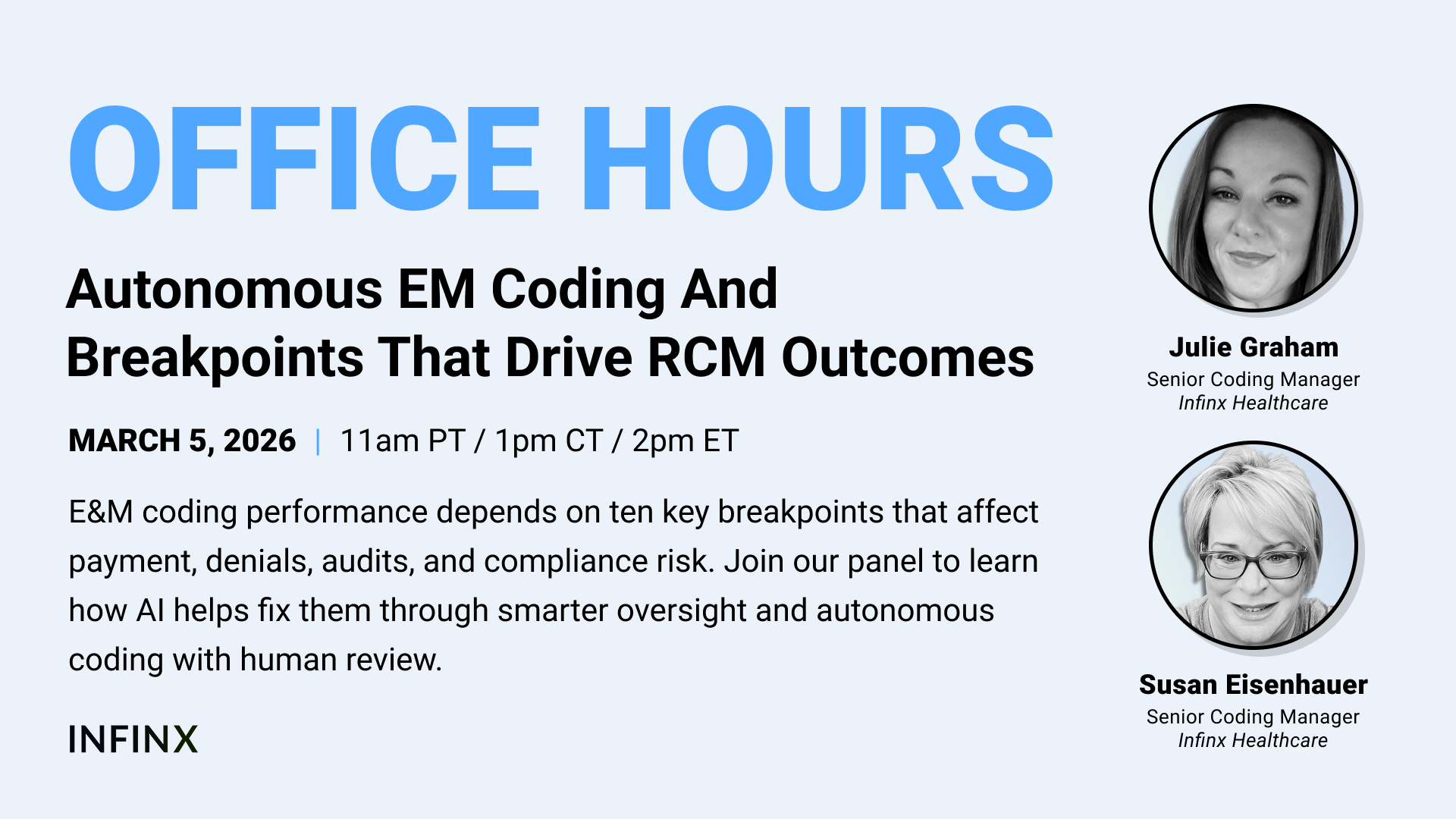 This Office Hours session is structured around ten breakpoints that determine whether E&M coding is accurate, efficient, and defensible. For each breakpoint, the panel will discuss what it looks like, what it costs in time, revenue, and risk, and what fixes actually improve outcomes. The discussion will also address where AI and autonomous E&M coding can help when paired with human specialist exception handling, including pattern detection by provider, documentation quality signals, and exception based review models that scale oversight without sacrificing defensibility.