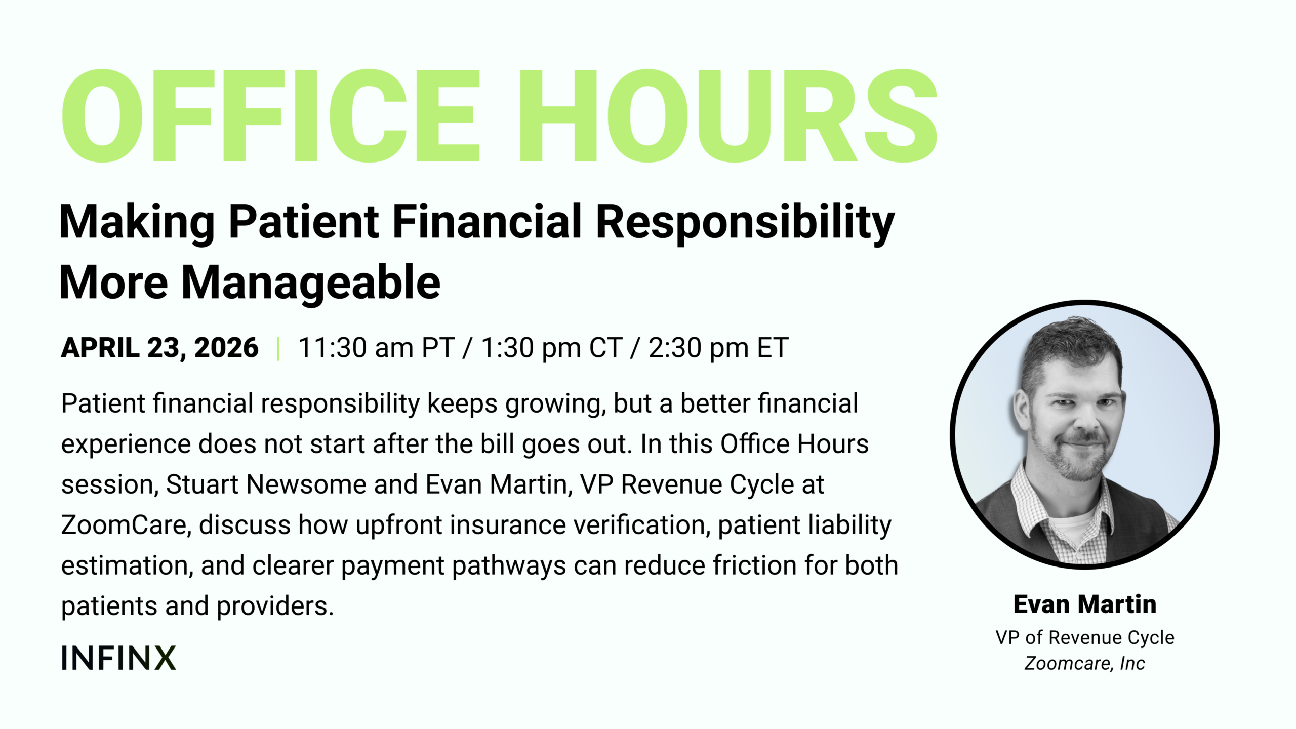 In this Office Hours session, Stuart Newsome talks with Evan Martin, VP Revenue Cycle at ZoomCare, about how providers can create a more supportive and operationally effective financial journey. The discussion will explore why upfront clarity matters, how better estimation and verification can shape payment conversations, and what healthcare organizations can do to reduce downstream collections challenges while improving the patient experience.