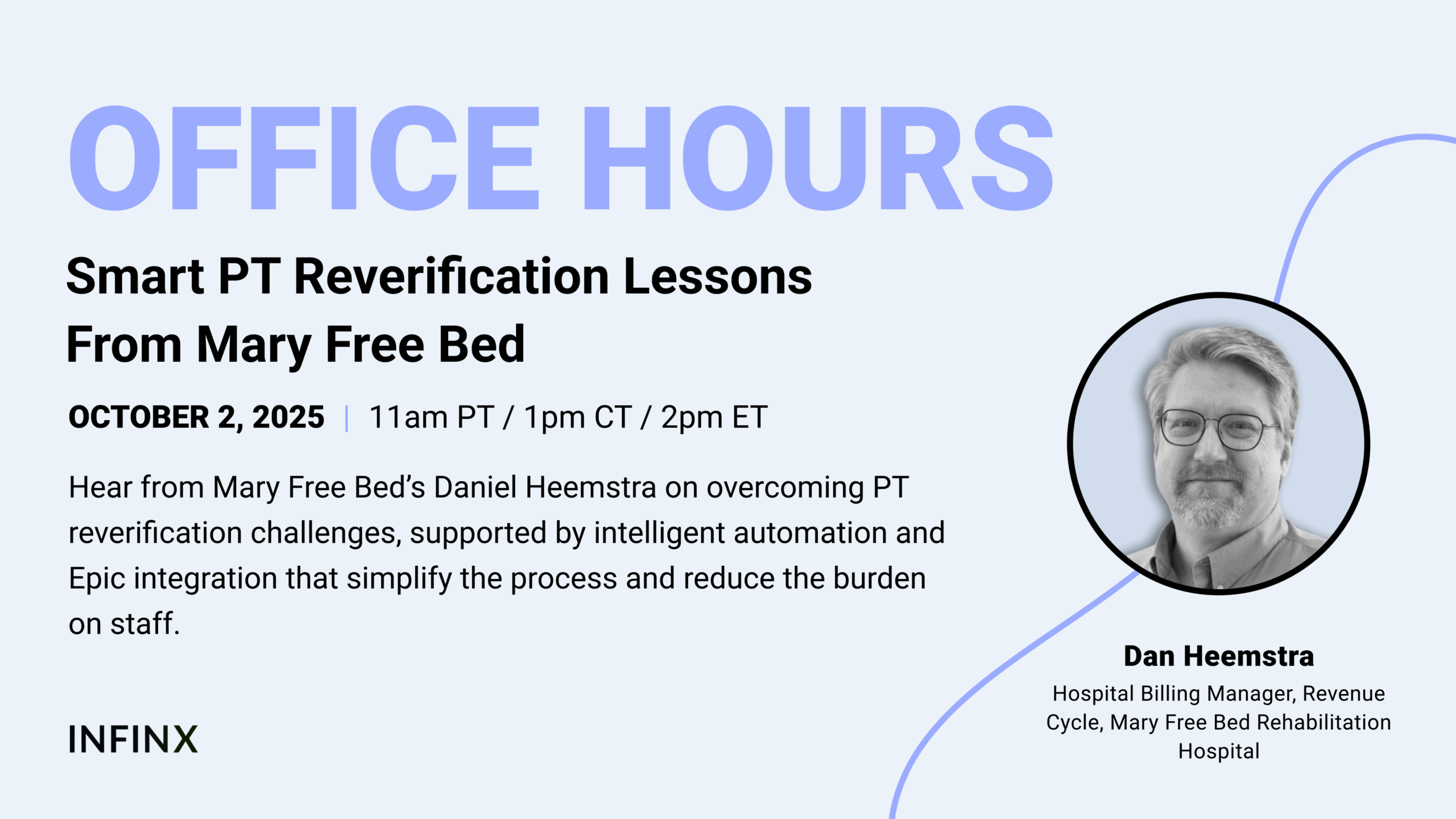 In this session, Dan Heamstra, Revenue Cycle Manager at Mary Freebed, shared how his team transformed PT reverification and prior authorization by partnering with Infinx and embracing intelligent automation and AI-driven patient access solutions.